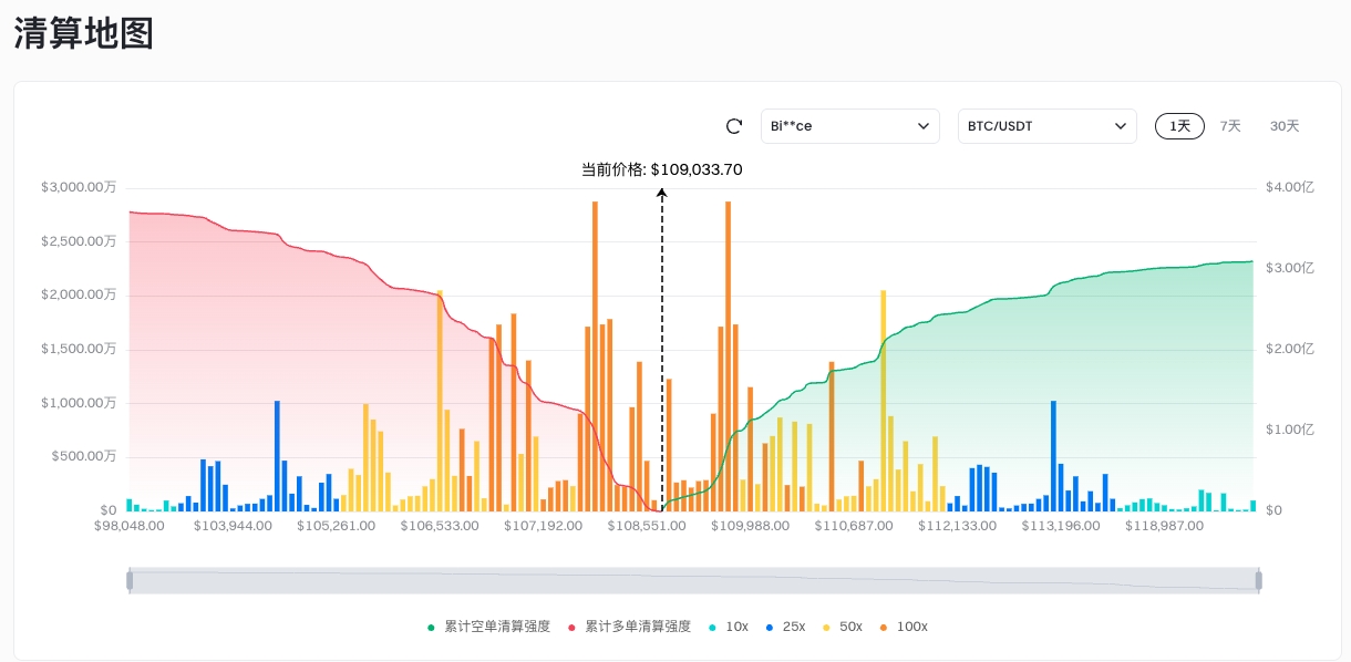 3、Gate BTC/USDT 清算マップでは、現在の 109,033.70 USDT を基準に、もし 107,710 米ドル付近に下落した場合、累計のロングポジション清算額が 9,801.17 万米ドルを超えます;もし 109,829 米ドル付近に上昇した場合、累計のショートポジション清算額が 8077.69 万米ドルを超えます。ショートポジションの清算額はロングポジションを大幅に上回るため、レバレッジ比率を適切に制御し、市場の変動の中で大規模な清算を引き起こさないようにすることをお勧めします。