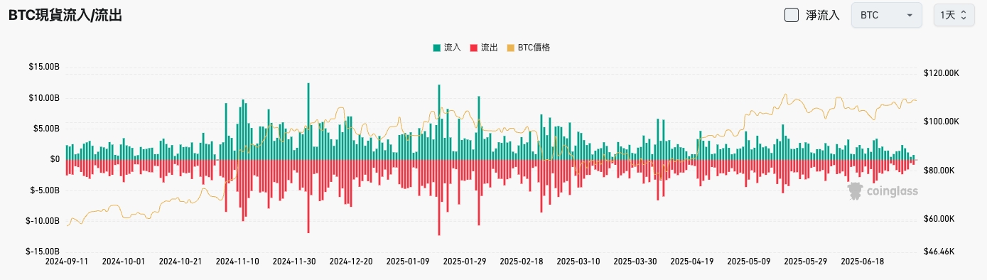 4、過去 24 時間内に、BTC 現物流入は 8.018 億ドル、流出は 7.941 億ドル、純流入は 0.077 億ドルです。