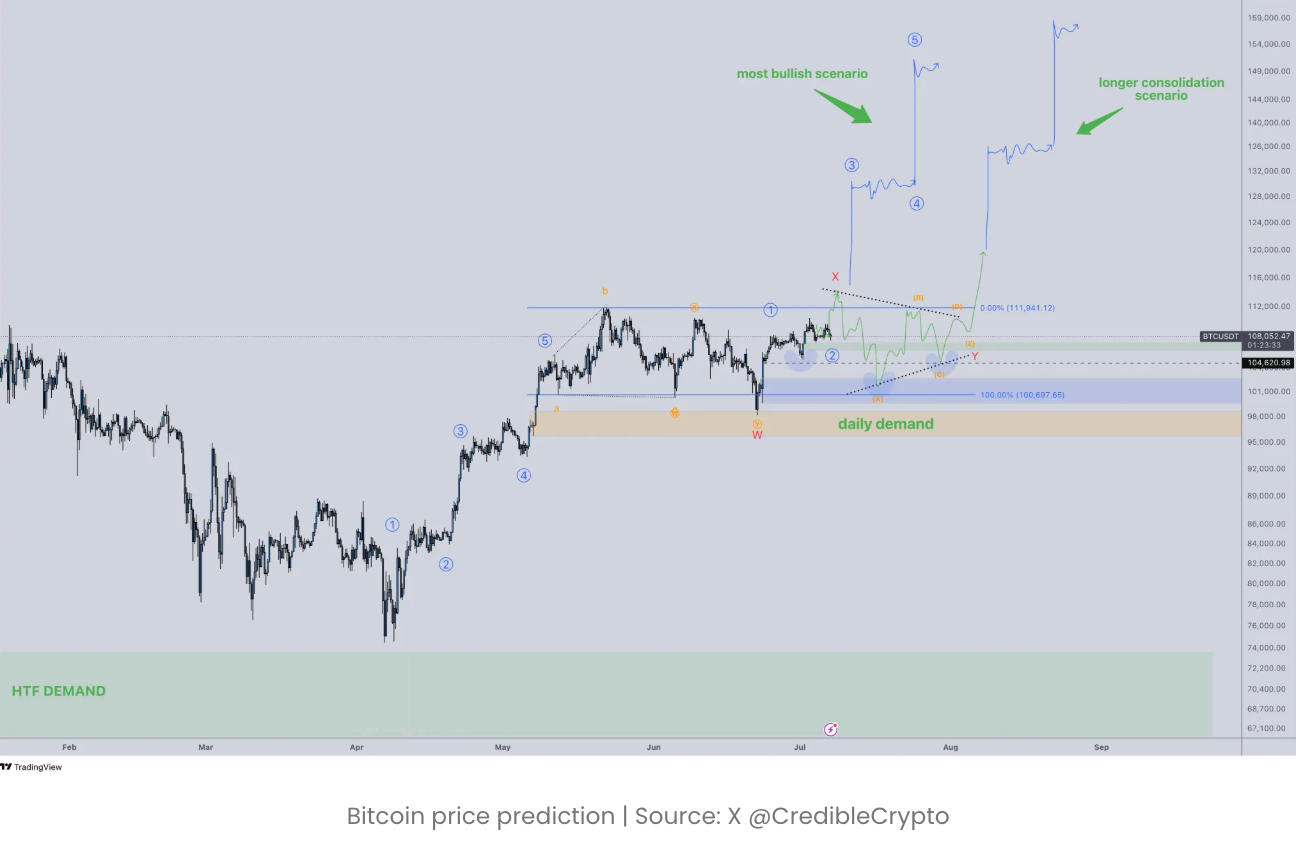 🔮 CrediBullのウェーブ理論とリスク警告 CrediBullの以前のエリオット波動理論に基づく考えは、価格が11万ドルの上方の高値で阻まれ、10.2万ドル前後の"青い領域"に戻り、数週間横ばいになった後に次の脈動が始まるというものでした。しかし彼はまた認めています:“このシナリオの確率は依然として高いですが、非ゼロの確率(non-zero chance)も存在します——次の上昇脈動はすでに始まっている可能性があります(最も強気なシナリオ)。”