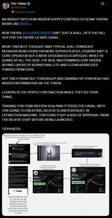 6月初、@tier1haterrはLexaproと「水煙帮」に対して、Believeエコシステムで発行されたトークン$DEALのバンドル販売を行ったと非難しました。