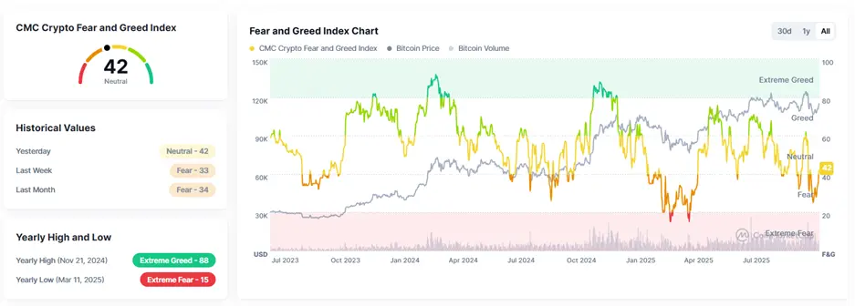 しかし、市場のセンチメントは中立のままで、恐怖と貪欲の指数は42、ビットコインのドミナンスは59.27%に上昇しています。