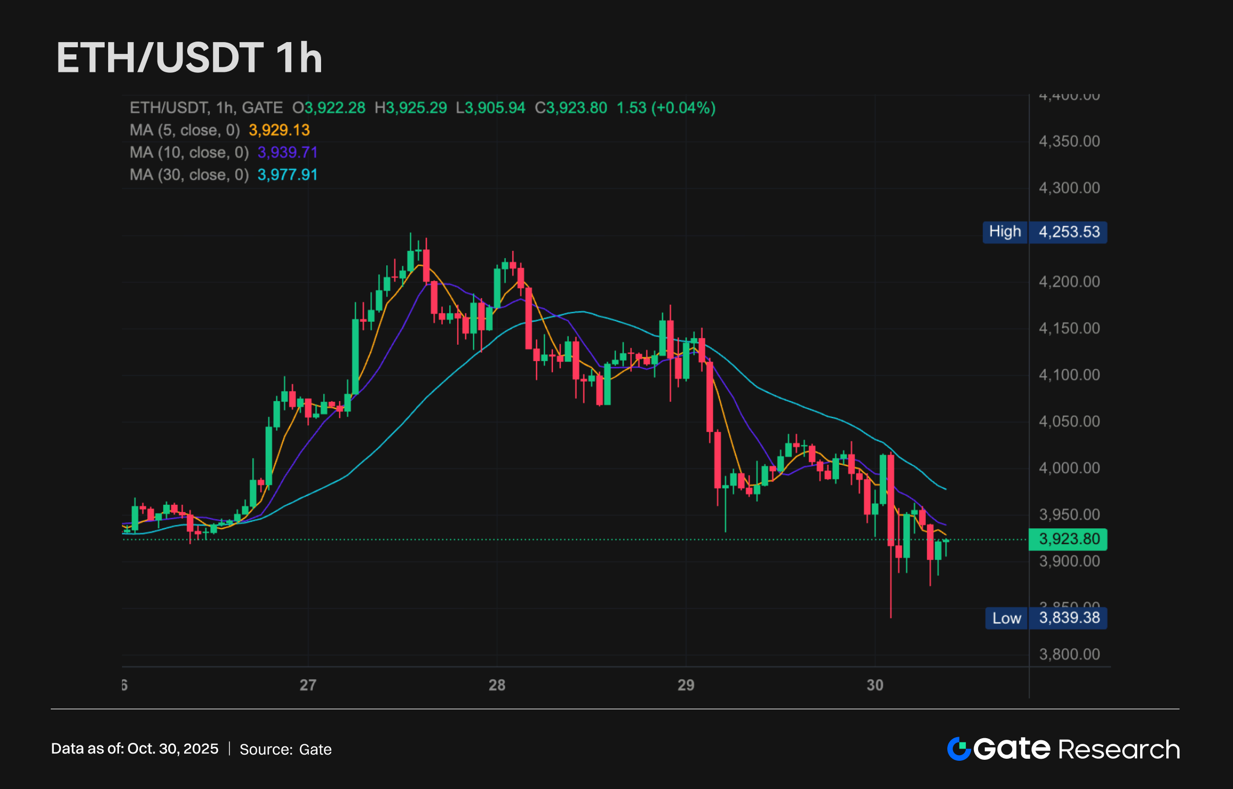 過去24時間、イーサリアムは3,839—4,037ドルの範囲で振動し弱まっています。4時間足のチャートでは、ETHはMA5、MA10、MA30の移動平均線を下回り、価格はボリンジャーバンドの下部に位置しており、短期的に明らかな圧力を受けています。日足の観点では、移動平均線のゴールデンクロスの範囲が徐々に狭まっており、ETHは依然として100日移動平均線の下に留まっており、この位置が現在の主要な抵抗となっています。もし価格が4,000ドルを突破し安定すれば、4,200ドルの供給ゾーンを再テストする可能性があります;逆に、上昇トレンドラインを突破できない場合、短期的にさらなる弱化を示唆する可能性があります。下方では、3,500ドルのゾーンが依然として重要な支持レベルです。