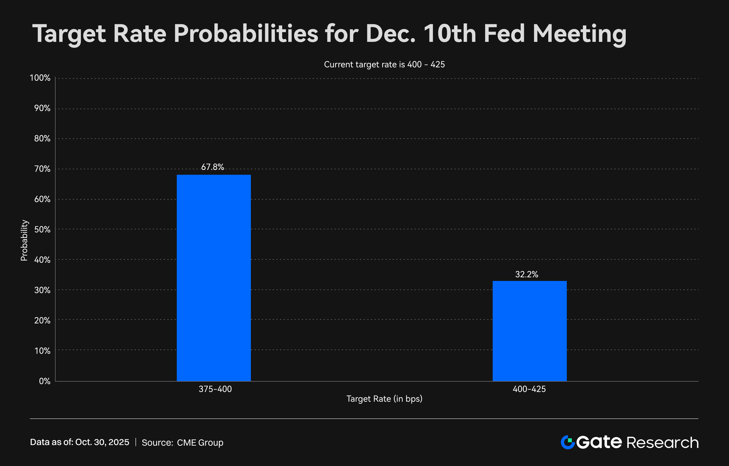 この影響を受けて、ビットコインは会議後に一時109,949ドルまで下落し、24時間での下落幅は4.17%となりました。一方、会議は12時間で全ネットワークの清算が5.32億ドルに達し、ロングポジションは4.26億ドルを占めました。Inflation Insightsのアナリスト、オマイール・シャリフは、政府の閉鎖および関連する公式経済データの不足が、12月に連続して3回目の利下げ計画を妨げる可能性があると考えています。12月10日に開催される会議で10月および11月の経済活動に関する公式データが反映されない場合、当局者が再度の利下げに合意することは難しいかもしれません。特に、9月のドットプロットが示すFOMC内の意見の相違を考慮すると、なおさらです。注目すべきは、トレーダーが12月の利下げに対する賭けを引き下げたことで、CMEの統計によれば、現在25bpの利下げが予想される確率はわずか67.8%であり、1日前にはトレーダーが50bpの利下げが90.5%の確率と見込んでいたことです。