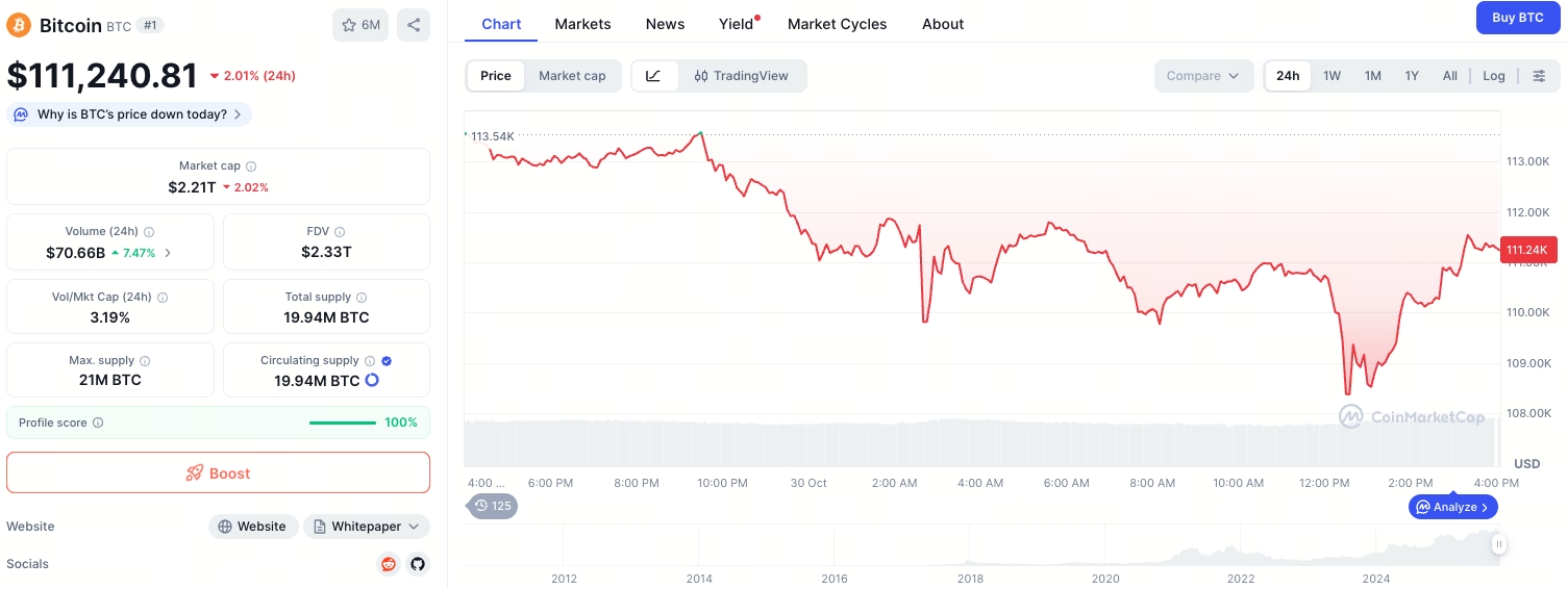 ビットコイン価格はこれらの好材料に対して迅速かつ強力に反応しました。テクニカル面では、ビットコインが108,900ドルの重要なサポートラインを守った後、買い圧力が著しく強化されました。110,700ドルのレジスタンスラインを突破することで上昇モメンタムが確認され、111,300ドルへのさらなる上昇への道を開きました。