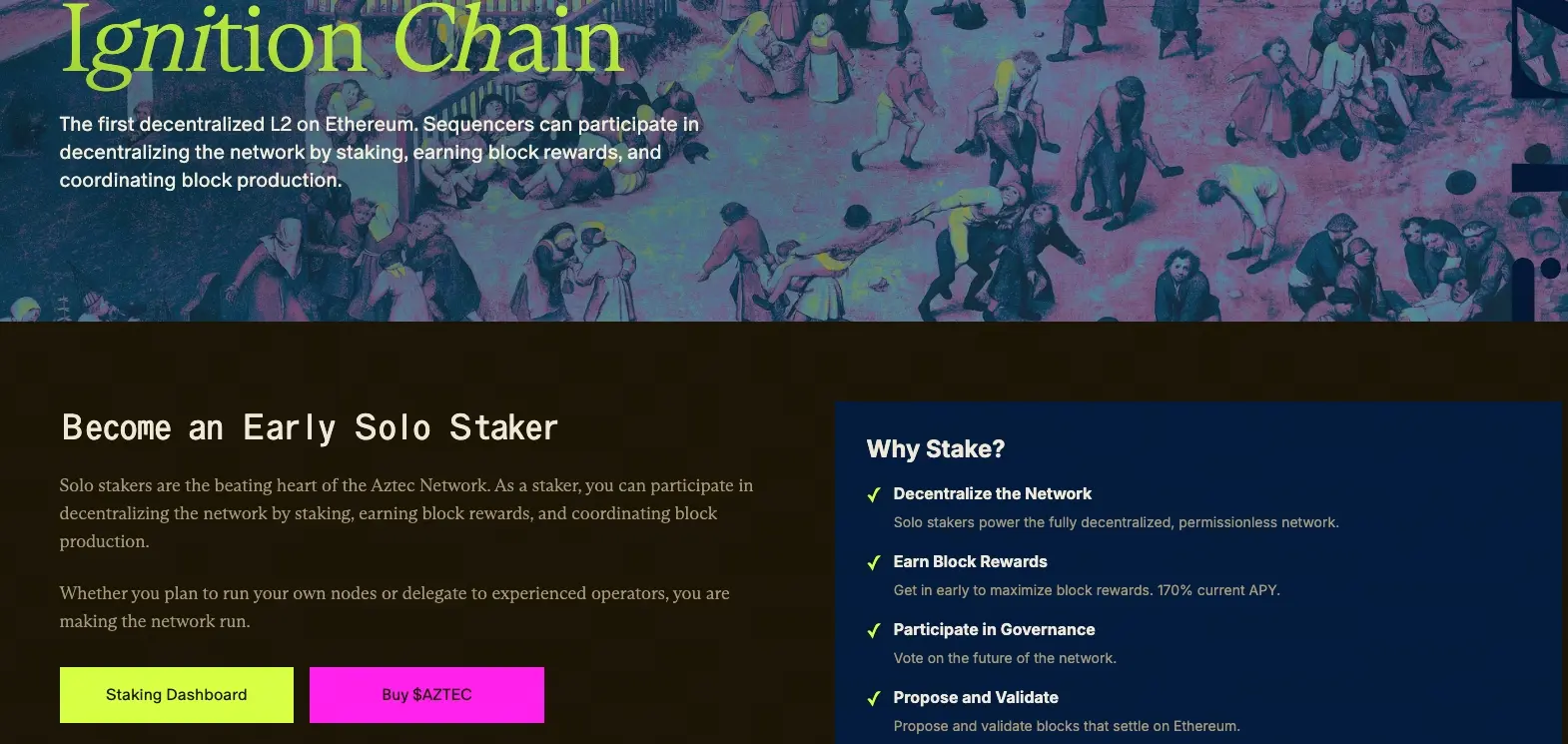 先週、AztecはそのAZTECトークンを販売することを発表しました。このトークンはIgnition Chainのネイティブ資産であり、ステーキング、ガバナンス、ブロック報酬に使用されます。バリデーターはネットワークでアクティブになるために20万枚のAZTECトークンをステークする必要があります。この閾値設計はPoS(プルーフ・オブ・ステーク)ネットワークでは非常に一般的で、バリデーターが誠実に行動するための十分な経済的インセンティブを持つことを目的としています。