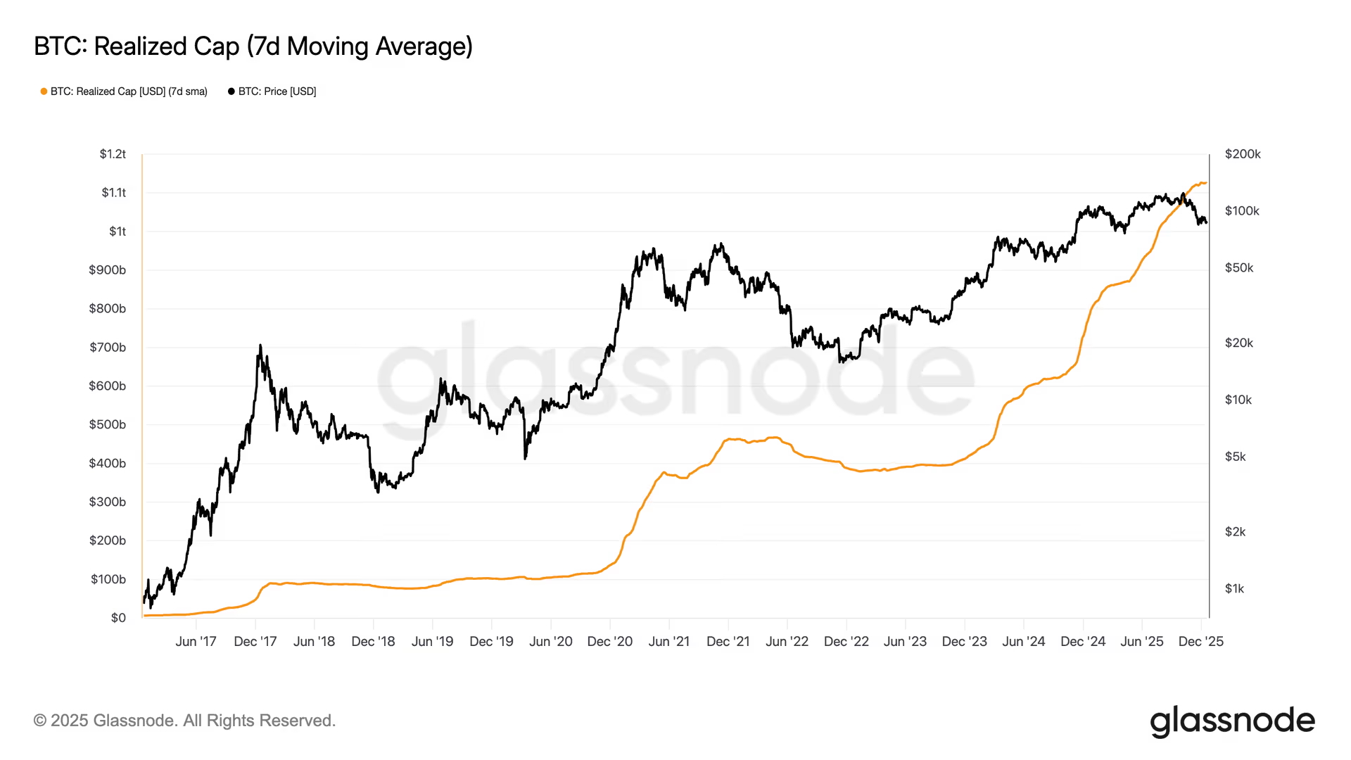 ブロックチェーン分析会社Glassnodeのデータによると、ビットコインが10月の歴史的高値から30%以上急落しても、「実現時価総額」は減少するどころか、修正期間中も上昇を続け、最近ようやく1.125兆ドル付近で横ばいとなった。