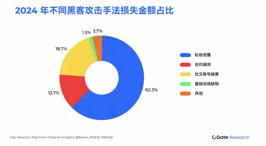 gate研究所の報告によると、2024年11月までに、ブロックチェーンエコシステムでは、累計1,740件のセキュリティ事件が発生し、総損失は337.44億ドルに達しました。そのうち、2024年だけで369件の事件が発生し、230.8億ドルの損失が発生しました。これは、ハッカー攻撃が持続的な脅威となっていることを示しています。特に、秘密鍵漏洩事件がすべての損失の62.3%を占めています。