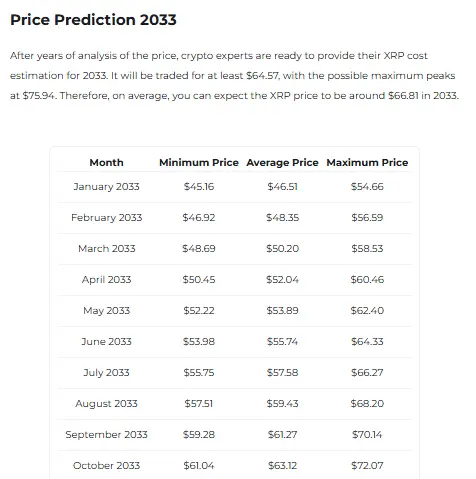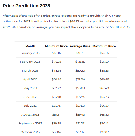 昨年の10月、XRPが1ドル未満で取引されていたとき、あるアナリストはそのトークンが一晩で$60 に急騰する可能性があると述べました。一方、ある暗号交換プラットフォームも、XRPが2033年10月までに$63 に上昇する可能性があると予測しています。