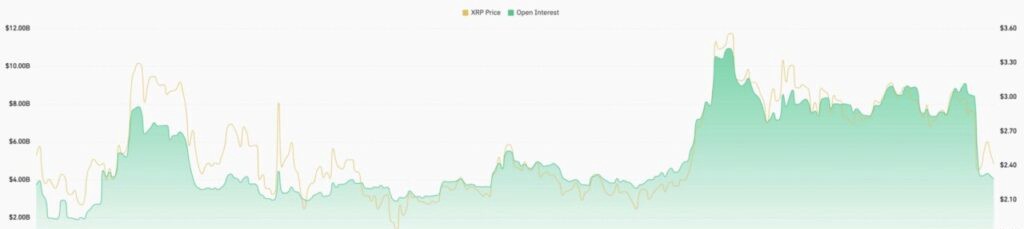 その結果、XRPの需要が弱まっている兆候があります。これを示す指標の一つが、オープン・インタレスト (OI)で、最近の暗号市場の暴落前の$9 億ドルから、劇的に40.5億ドルに減少しました。OIの減少は、一般的に資産への関心または需要の減少を示します。