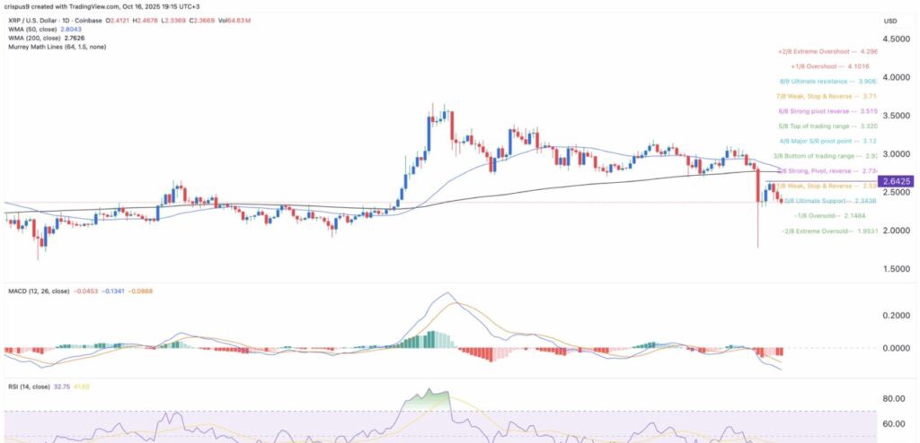 したがって、現在の最も可能性の高いXRP価格予測は弱気であり、初期目標は$2の範囲にあります。この目標は現在の価格より約16%低く、またMurrey Math Linesインジケーターの極端なレベルとも一致します。この見解は人気アナリストのアリ・マルティネスによっても強化されています。
