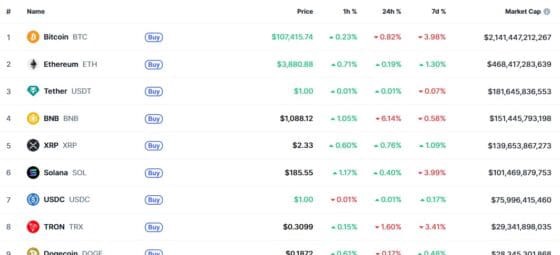 イーサリアム (ETH) は $3,880 で取引されており、前日比で 0.19% 上昇していますが、8 月の最近の高値からは約 25% の下落です。リップル (XRP) とソラナ (SOL) はわずかに反発し、それぞれ 0.76% と 0.40% 上昇しましたが、全体的な上昇の勢いは限られています。特にソラナは、週単位で 3.99% の下落を維持しています。
