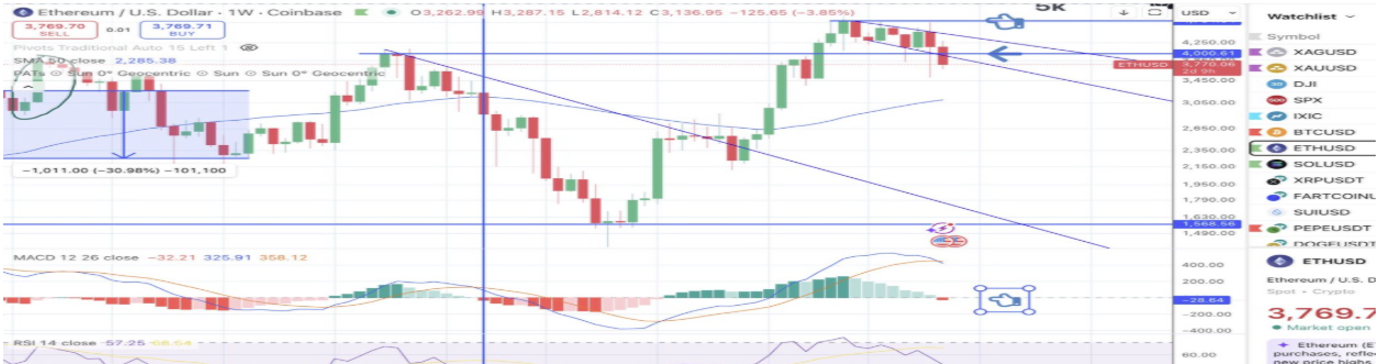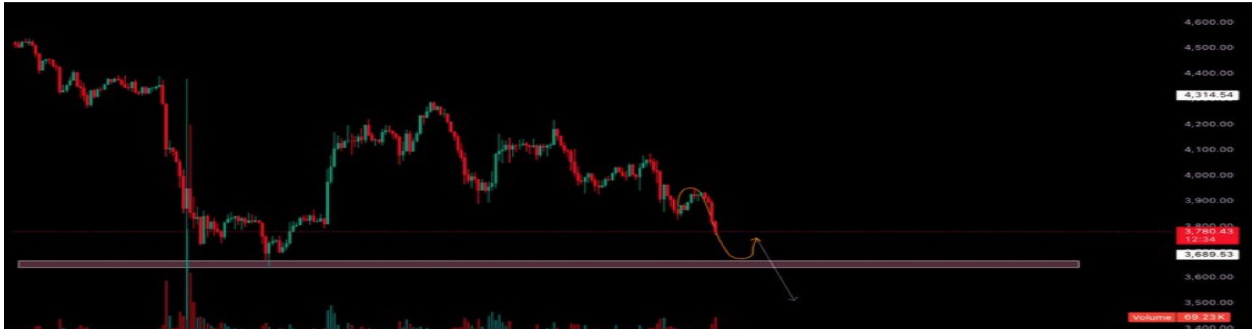 他のアナリストも同様の懸念を示し、イーサリアムが現在「クラッシュゾーン」に近づいていると述べています。しかし、あるアナリストは、$3,690 ~ $3,750の範囲を、買い手が再び入る可能性のある短期的な需要エリアとして強調しました。次の上昇を引き起こす可能性があります。