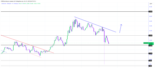 彼は、$16.80を超える強気のブレイクアウトが再び買い圧力を引き起こす可能性が高いと説明しました。そのような動きは、$19.30のターゲットに向けたラリーへの道を開く可能性があり、過去の価格動向では強い反応と利益確定の可能性が示されています。