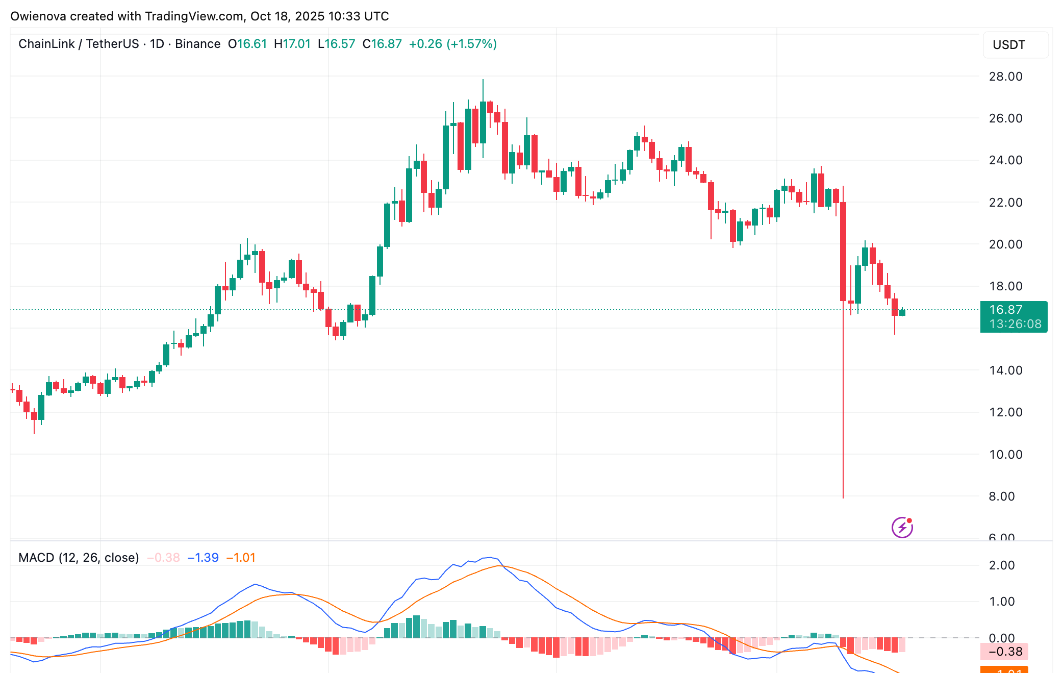 アナリストによると、LINKの$16 日次サポートレベルの再テストは、予想通りに展開されました。このゾーンは現在、重要な決定ポイントを表しており、その上に留まることで、次の主要な抵抗である$20 に向けた反発を引き起こす可能性があります。市場の状況が安定していれば、その先も可能です。