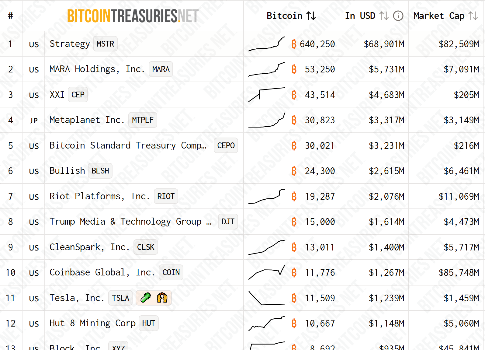 第2位はMARA Holdings (Marathon Digital)で、53,250 BTC、約57億ドル相当です。次に第3位はXXI (CEP)で、43,514 BTC、価値は47億ドルです。日本のMetaplanet (MTPLF)が第4位で30,823 BTCを保有し、ビットコインスタンダードトレジャリーカンパニー(CEPO)が第5位にランクインし、30,021 BTCで締めくくります。