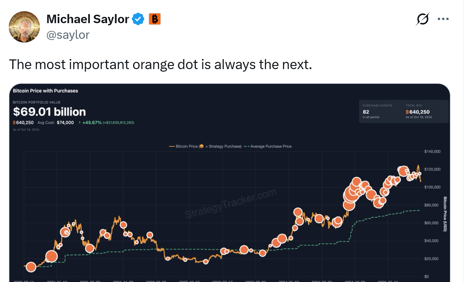 このチャートは82件の購入イベントを追跡しており、Strategyの保有量は640,250 BTCで、現在の価格で約$69 億ドルの価値があります。これは、1コインあたり74,000ドルの総コストベースから45.6%の増加です。