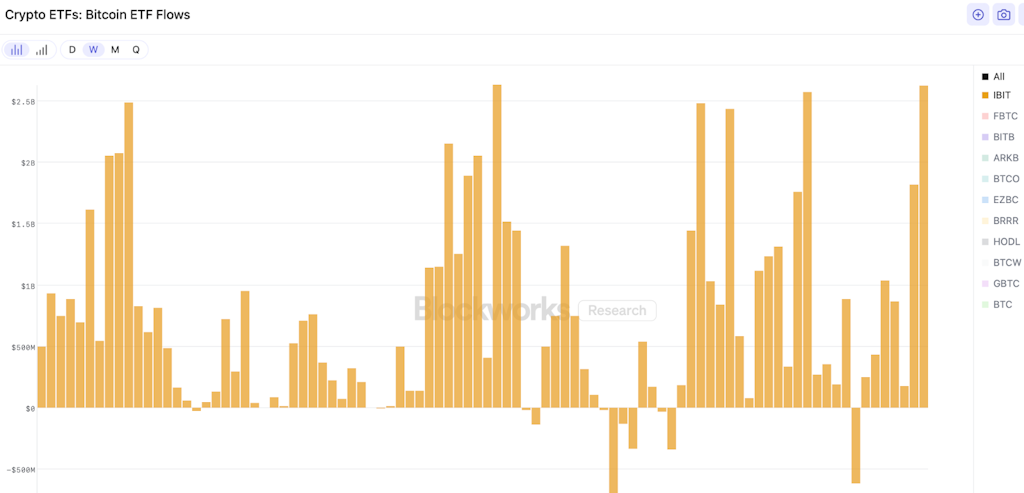 ブラックロックのビットコインETF )IBIT(とイーサリアムETF )ETHA(は、それぞれ約)億と約$90 億のAUM合計を誇っています。IBIT $16 は、以下に示す週次フローで、史上最も成長が早いETFであり、最近AUMでトップ20に入りました。