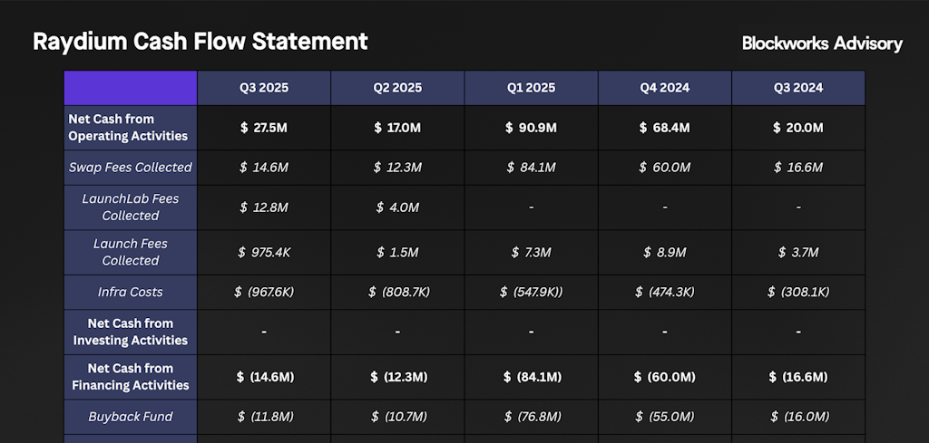 Raydiumは2025年第3四半期に2750万ドルの営業キャッシュフローを生み出し、第2四半期の1700万ドルから62%の増加を記録しました。この改善は、スワップとLaunchLab手数料の収集が増加したことによって推進され、合わせて$27M の流入に寄与しました。インフラコストは引き続き上昇傾向にあり、967.6K (+20% QoQ)に上昇しましたが、総流入に対しては控えめなままでした。特に、四半期の終わりに収集されたLaunchLab手数料の一部は、期末までに自己株買いや財務移転にまだ配分されていなかったため、報告された営業キャッシュがわずかに膨らんでいました。