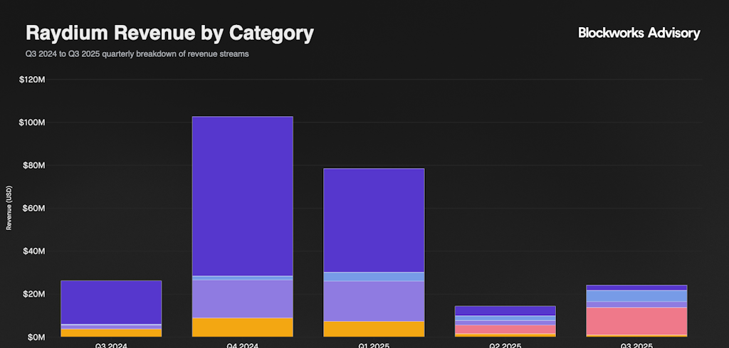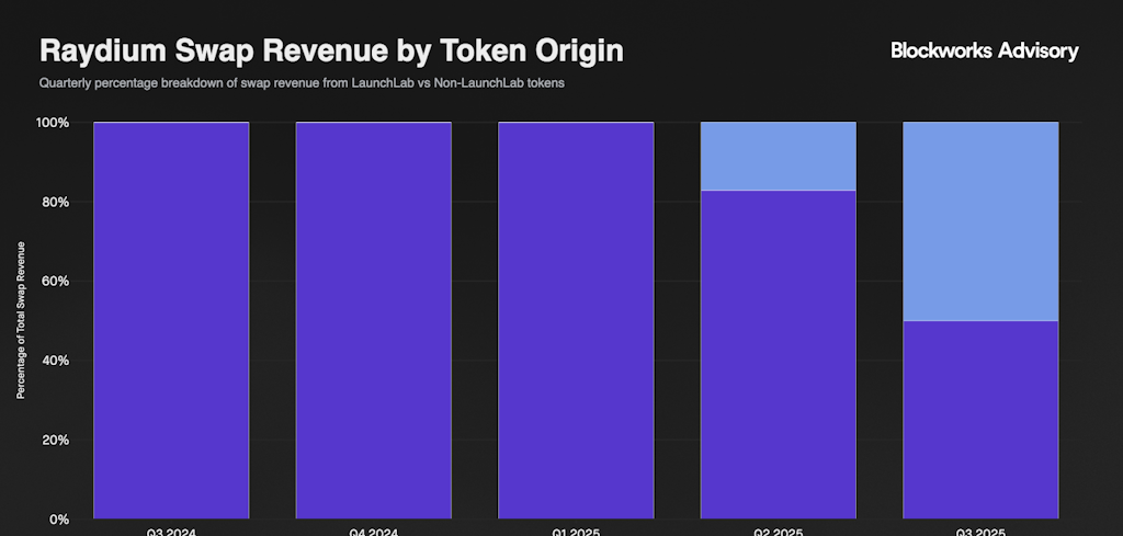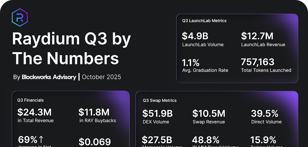 *このトークンホルダー報告書はBlockworks Advisoryの製品です。各四半期報告書は、高精度の独自データと当社のアナリストによる専門家のコメント、プロトコルチームによる経営者のコメントを組み合わせており、ファンダメンタルズの観点からプロトコルの包括的な視点を提供します。**このレポートのダウンロード可能なPDF版は、オフラインアクセスを好む読者や、社内でレポートを共有したい読者のために利用可能です。**** ** * ** *****エグゼクティブサマリー**---------------------2025年第3四半期は、Raydiumが完全にマルチプロダクトのアイデンティティに成長した四半期を示しています。4月中旬にLaunchLabがデビューした後、製品は運用規模に達し、プロトコルの主要な収益源となり、RaydiumがSolanaエコシステム内で価値を獲得する方法を再定義しました。トークン取引からトークン創出へと拡張することで、RaydiumはSolanaのトークン発行経済におけるコア参加者としての地位を確立しました。LaunchLabの最初のフルクォーターは、発行と二次流動性の統合を検証しました。このプラットフォームは**$12.8Mの収益(+220% QoQ)**をもたらし、総収益(**$24.3Mの半分以上に相当し、+69% QoQ)**、スケーラビリティを示し、Raydiumをトークンローンチの主要な会場として確立しました。スワップ収益のほぼ半分はLaunchLabトークンから生まれ、新規発行がAMM、CPMM、CLMMプール全体での取引を直接的に増幅していることを示しています。発行を超えて、Raydiumのスワップエンジンは引き続き適応を続けました。スワップ収益は**前四半期比18%増の1,050万ドル**となり、CPMMおよびCLMMプールが手数料生成の安定した基盤を支える一方で、AMMは投機活動やミームトークンサイクルに結びついた高ベータのドライバーとして機能しました。この安定した流動性と周期的な流動性のバランスが、Raydiumに柔軟な手数料構造を与えています。**営業キャッシュフローは2750万ドルに達しました**。これは第2四半期からの強い回復を示しています。自社株買いと財務配分は1460万ドルと依然として重要ですが、**今四半期の営業収入の再利用は少なくなりました**。これは今四半期のLaunchLab収益の先送りされた配分を反映しています。Q3のパフォーマンスは、成長するSolana DEX市場における強いモメンタムを反映していました。Raydiumは**$51.9Bのボリュームを処理し(+31% QoQ)**、**市場シェアを15.9%に拡大**しました。これは、より大きな断片化にもかかわらず、広範なエコシステムを上回る結果です。この四半期は、Raydiumがマルチプロダクト流動性プラットフォームへの進化を確認し、アグリゲーター統合とLaunchLab主導の取引深度に継続的に焦点を当てていることを示しました。### **マネジメントコメント***Q3の収益は$24.3M (で、前四半期比で69%増加)し、Solana DEXの市場シェアは15.9%に上昇し、RaydiumはSolanaのオンチェーン取引エコシステムを推進する主要なプロトコルとしてのパフォーマンスを維持しました。同時に、この四半期はDeFiにおける競争のダイナミクスに関する重要な真実を明らかにしました。**確立されたプラットフォームからBonkFunのような新規参入者へのメムコイン取引量の急速な移行は、ソラナ内およびBNBのような異なるチェーンを通じて、投機的市場におけるユーザーの忠誠心が依然として取引的であることを示唆しています。永続的取引においても同様のパターンが見られ、既存のリーダーたちは市場シェアに対する挑戦を受けました。さらに、Q3での独自AMM (pAMMs)の出現は、ソラナでの大規模な取引量を生み出しましたが、これらは依然としてSOL-USDCのような手数料の低いティアペアに集中しています。**ヘッドラインpAMMのボリュームは印象的に見えるものの、運用の現実はより複雑です。pAMMは現在、アクティブな在庫管理と中央集権的な監視を必要とし、これはコアルートを超えた展開を制限します。さらに、流動性の安定性に関する疑問が提起されており、特にボラティリティが高まる期間において、オンチェーンプロトコルが清算のために最も必要とされる時期の流動性が不安定になる可能性があります。非管理型AMMであるRaydiumは、外部からの入力や中央集権的介入に依存せず、全資産のスペクトルにわたる信頼できる、許可のない流動性を提供するという根本的に異なる市場ニーズに応えています。**流動性モデルの違いによる収益の影響も同様に重要です。pAMMは、タイトなスプレッドと非常に低い手数料で高い取引量を推進しますが、真の価格発見を可能にする単一の高手数料AMMプールは、低手数料Tier環境における確立されたペアのコモディティ化ルーティングによって生成される収益の何倍もの収益をもたらすことができます。Raydiumは、コアペアの効率的なルーティングと新しい資産の収益性の高い価格形成の両方に対応する能力を持ち、単一の競争ポイントに対して抵抗力のあるバランスの取れた収益プロファイルを生み出しています。Raydiumは引き続き資本効率の改善