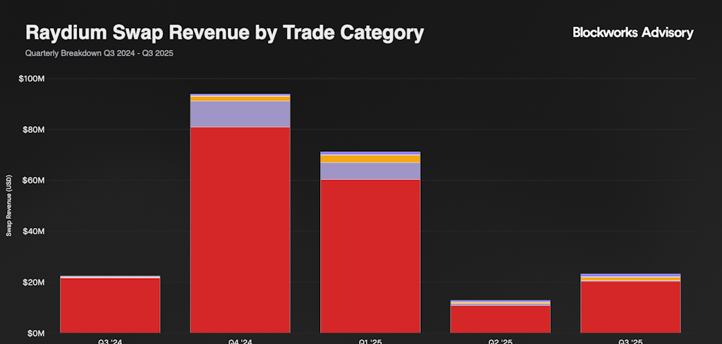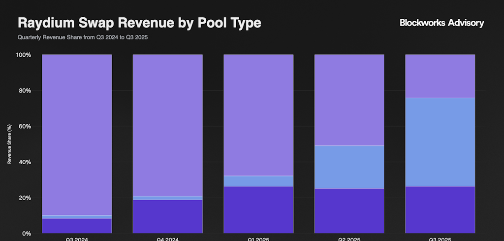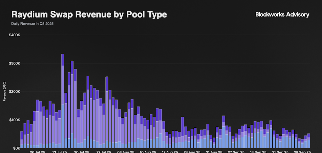 RaydiumのDEXセグメントは、2025年第3四半期にスワップ収益として1050万ドルを生成し、第2四半期の890万ドルから四半期ごとに17.7%の増加を示しました。この四半期は、取引活動の回復力と、流動性がプールタイプ全体にどのように展開されるかの構造的進化の両方を強調しました。