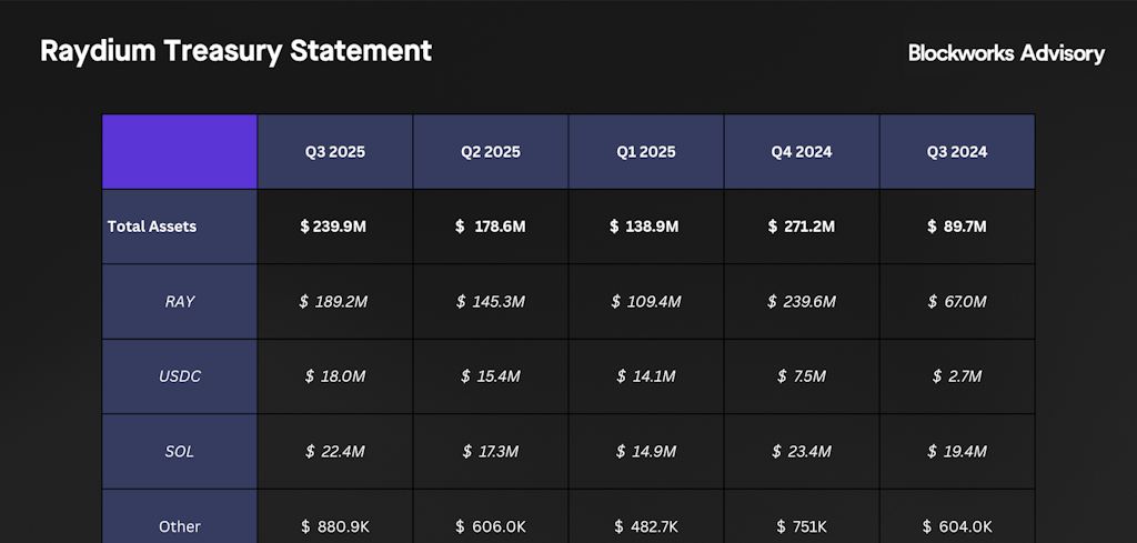 Raydiumの財務は2025年第3四半期を$239.9Mで締めくくり、前四半期の$178.6Mから34%の増加を示しました。この成長は、RAYトークンの価値上昇と安定した蓄積の組み合わせによって促進され、プロトコルが運用パフォーマンスと共に資本を複利化する能力を強調しています。