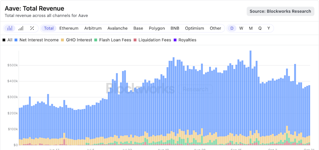 四半期は、Aaveの貸出機がしっかりしていて、ますます退屈に見える形で終了しました—良い意味で。プロトコルの収益の大部分は再び純利息収入によって牽引され、フラッシュローンや清算は比較的少ない割合でした。それこそが、正常化された金利体制においてシステムが機能すべき方法です。