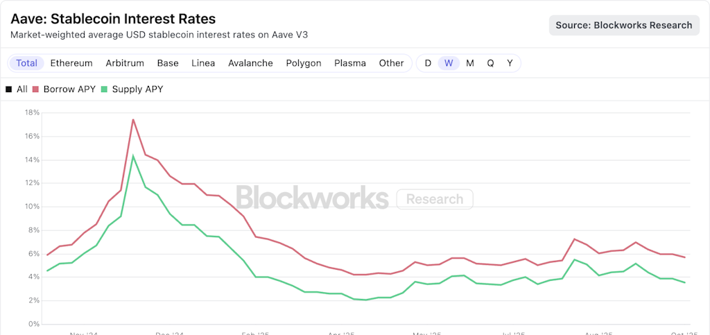 もしそうなれば、Aaveの指標はすぐに状況を示すはずです:スプレッドが広がり、利用率が上昇し、純利益が預金とともに増加し続けます。