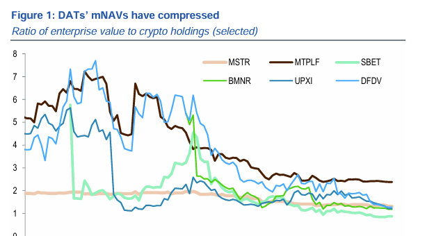 いくつかのDATは、戦略、ビットマイン、メタプラネット (MTPLF)、シャープリンクゲーム (SBET)、ユーペクシ (UPXI)、そしてDeFi開発コーポレーション (DFDV)を含む、この重要なレベルを下回るmNAVを経験しました。