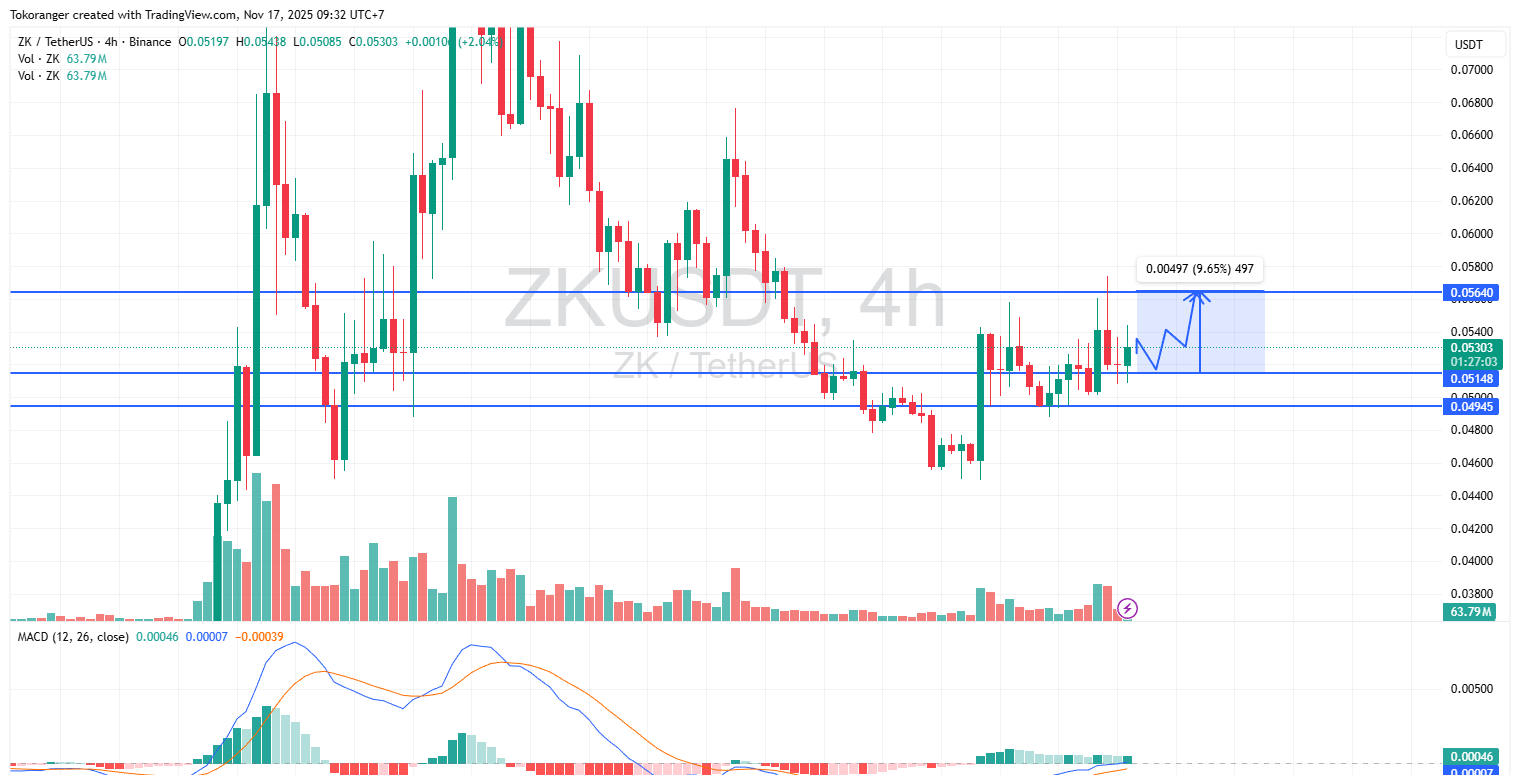 ZKは、強力なサポート**$0.04945から反発した後、整然とした上昇構造を構築し始めているようです。この価格帯は、これまでに何度も「床」となっていました。現在、ZKは理想的なエントリーポイントである$0.05148のエリアの上で安定しており、主要なレジスタンス$0.05640に向けて小さなスイングパターンを形成しながら、約+9.6%**の上昇ポテンシャルを持っています。