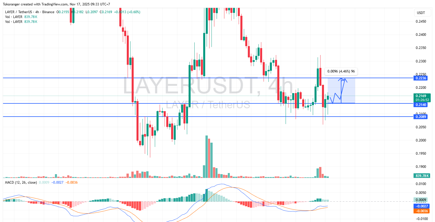 LAYERは現在、2つの重要なレベルの間で美しく動いています:サポート**$0.2140とレジスタンス$0.2236で、これは最近数日間の価格の「戦場」となっています。形成された小さなスイングパターンは、バイヤーがエントリーエリアを守るために活動を始めていることを示しており、一方でMACDは徐々に上向きに回転しており、ブル市場のモメンタムが再び熱を帯び始めているサインです。価格が$0.2140を上回っている限り、$0.2236への上昇の可能性は非常に健全であり、利益のチャンスは約+4.4%**です。