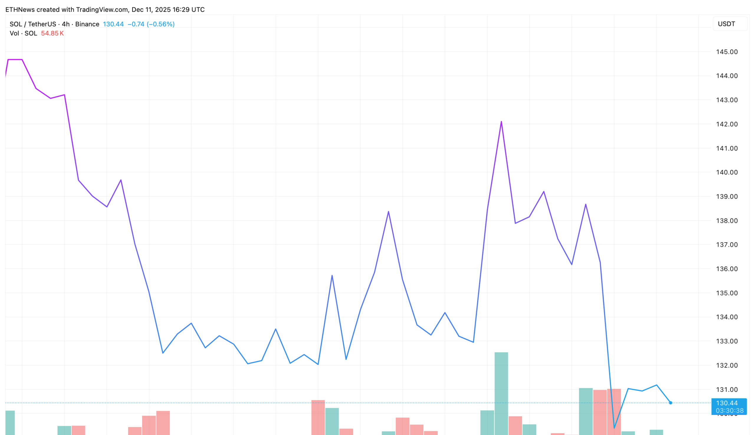 チャートは、SOLが$140–$142 のリジェクションエリアから滑り落ち、$130 ゾーンの中間に戻っていることを示しています。下降中の出来高は著しく増加し、売り手が引き続きコントロールしていたことを確認しています。