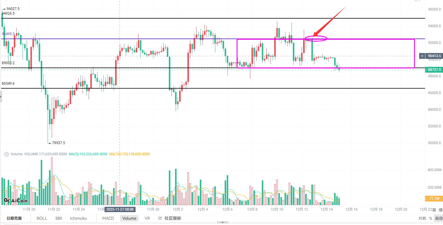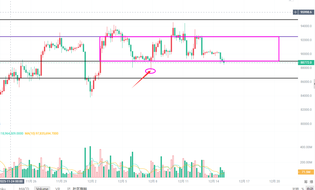2. BTC:価格が88000-87500付近まで下落したら買いエントリー、ストップは86500。  利確は89500-92500を目標に。 価格は時々刻々と変わるため、投稿には遅延があります。具体的な取引はリアルタイムの相場を基準としてください。 最後に、前回の記事でも触れた今週の二つのポイントを忘れないでください。短期的には試し買いを中心にし、目標ゾーンから外れたら年末までに大きな利益を得る最後のチャンスです。