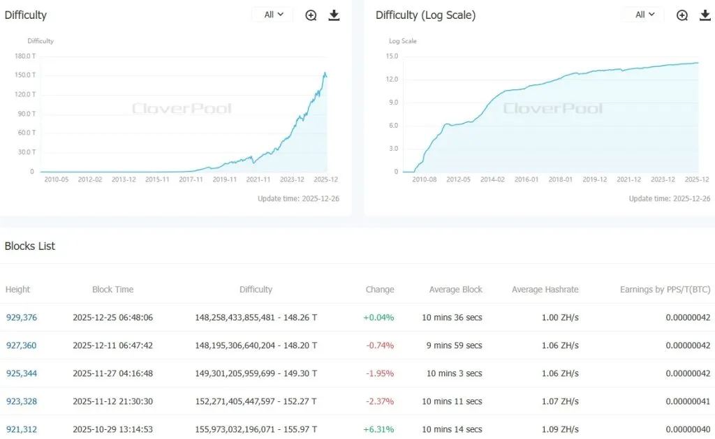 12月25日、ビットコインのマイニング難易度はわずか0.04%増加し、148.26 Tに達しました。