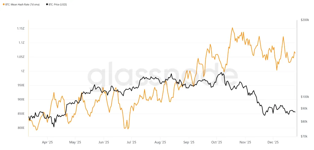 # ビットコインのマイニング難易度が上昇12月25日、ビットコインのマイニング難易度はわずか0.04%増加し、148.26 Tに達しました。出典:CloverPool。10月29日に史上最高の155.97 Tに達した後、指標は連続して3回の低下を記録しました:2.37%、1.95%、0.74%。この間、ビットコインのハッシュレートは1 ZH/sを上回り続けました。Glassnodeによると、平滑化された7日移動平均値は約1.06 ZH/sの水準にあります。出典:Glassnode。慎重な難易度の上昇は、最近のネットワーク計算能力の削減がマイナーの活動に顕著な影響を与えていないことを示していますと、TheMinerMagは指摘しています。12月中旬のハッシュレートの急落は、中国当局による新疆ウイグル自治区のビットコインファームの閉鎖と関連付けられることもあります。その他の要因として、米国の寒波も挙げられています。ネットワークの能力削減は一時的な現象でしたが、VanEckのアナリストは、採算が取れなくなった機器を停止させるマイナーの「降伏」を宣言しました。TheMinerMagの計算によると、ネットワークの難易度は最大値から約4%調整されました。この期間中、デジタルゴールドの価格は約20%下落しました。歴史的に、このような乖離は弱いプレイヤーの市場離脱を引き起こす傾向があります。> > *「現時点では、そのような降伏は実現していません。難易度の限定的な低下とハッシュレートの安定は、ネットワークが大規模な停止なしに経済的ストレスに対処していることを示しています」と、業界誌の専門家は強調しています。*> > > ブロックチェーンの技術的パラメータの安定は、ハッシュレートが1日あたり$38 PH/s付近に留まり続け、採掘経済に圧力をかけ続けることを意味します。出典:Hashrate Index。12月には、機関投資家がマイナーよりも早くビットコインを買い集め始めたことも思い出されます。