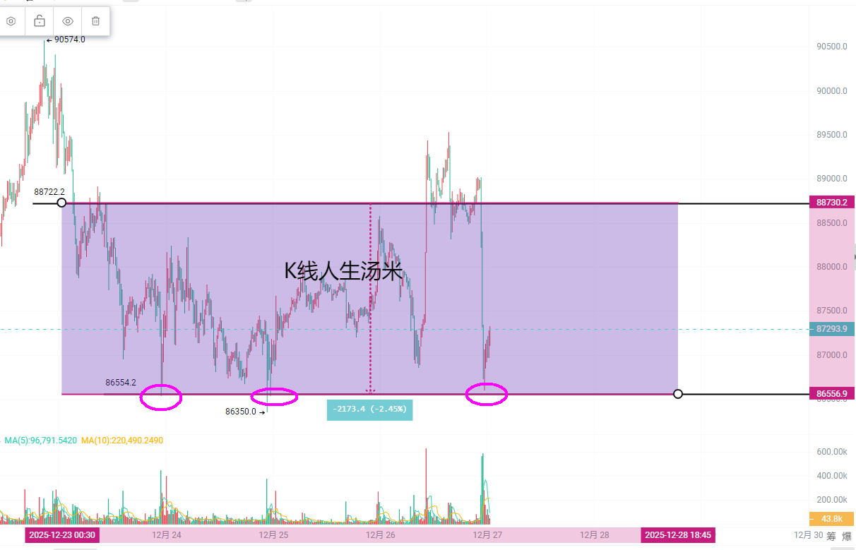 ビットコインやイーサリアムの今日の動きについて、まずは一つのリアルな喜びの報告を。昨晩、ファンの方からフィードバックをもらいました。1ヶ月も経たないうちに1400ドルで17000ドルを稼いだとのこと、しかも私の記事で示した圧力・サポートラインの操作を参考にしただけだそうです。聞いて本当にとても嬉しかったです。なぜなら、私が毎日皆さんに共有し続けていることが価値があると証明されたからです。日内の相場分析は役に立ち、実際にあなたの稼ぎに貢献できるものです。クリスマスの間、アメリカの株式市場は数日休場が続き、流動性は依然として低い状態です。昨日は自分も休暇を取りました。なぜなら、この2日間の相場も完全にトミーの操作範囲内で動いており、クリスマスイブでも皆さんに多空両方のチャンスがあることを何度も強調してきました。重要なのは、忍耐強くエントリーのタイミングを待つことです。だからこの2日間、多くのファンから「多も売りも満足した」との反応がありました。相場は通常のように急激に動くことはなく、今は4時間足の周期内で横ばい・震荡しています。こういう時は、追い高や売り崩しを避け、少し利益が出たらすぐに撤退し、この空白期間を利用して基本的なスキルを磨くことが大切です。相場が動き出した時にしっかり掴めるように準備しておきましょう。#BTC#ETH