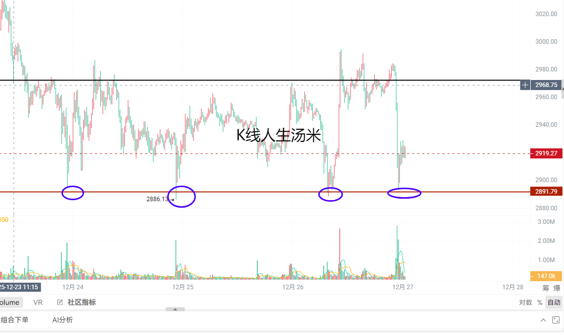 したがって、今日の戦略はサポートラインまでのリバウンドを待ち、安定したら買いを入れて抵抗ラインまで反発を狙います。もし勢いが弱い場合は、防御に回り、無理に突っ込まないことです。今のペースは、リトライを確認して低買いを狙うか、反発して抵抗に遭遇したら一旦離脱することです。イーサリアムの今日のサポートエリアは2887-2788、抵抗エリアは2980-3030です。同じくこの範囲内で調整し、2887や2788で安定すれば低買いの好機です。反発は2986から3030まで。出来高が突破できない場合は、一旦離脱し、ペースを待つことが重要です。無理に突っ込まず、リトライのタイミングを待ちましょう。今日のポイントは、クリスマスの流動性低下と市場の横ばい整理です。サポートまでのリバウンド買いと、抵抗までの反発売りを少しずつ取るのが、今日の最も安定した戦略です。