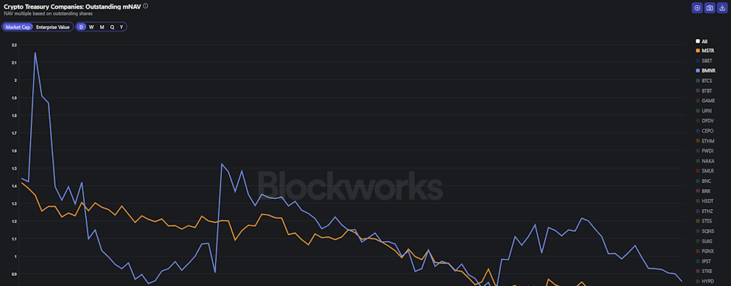 デジタル資産のトレジャリーは引き続き圧力を感じており、mNAV倍率はさらに圧縮しています。MSTRとBMNRは現在、mNAVレベルで0.69と0.85で取引されており、新年の始まりとともにトレジャリー取引への圧力が示されています。