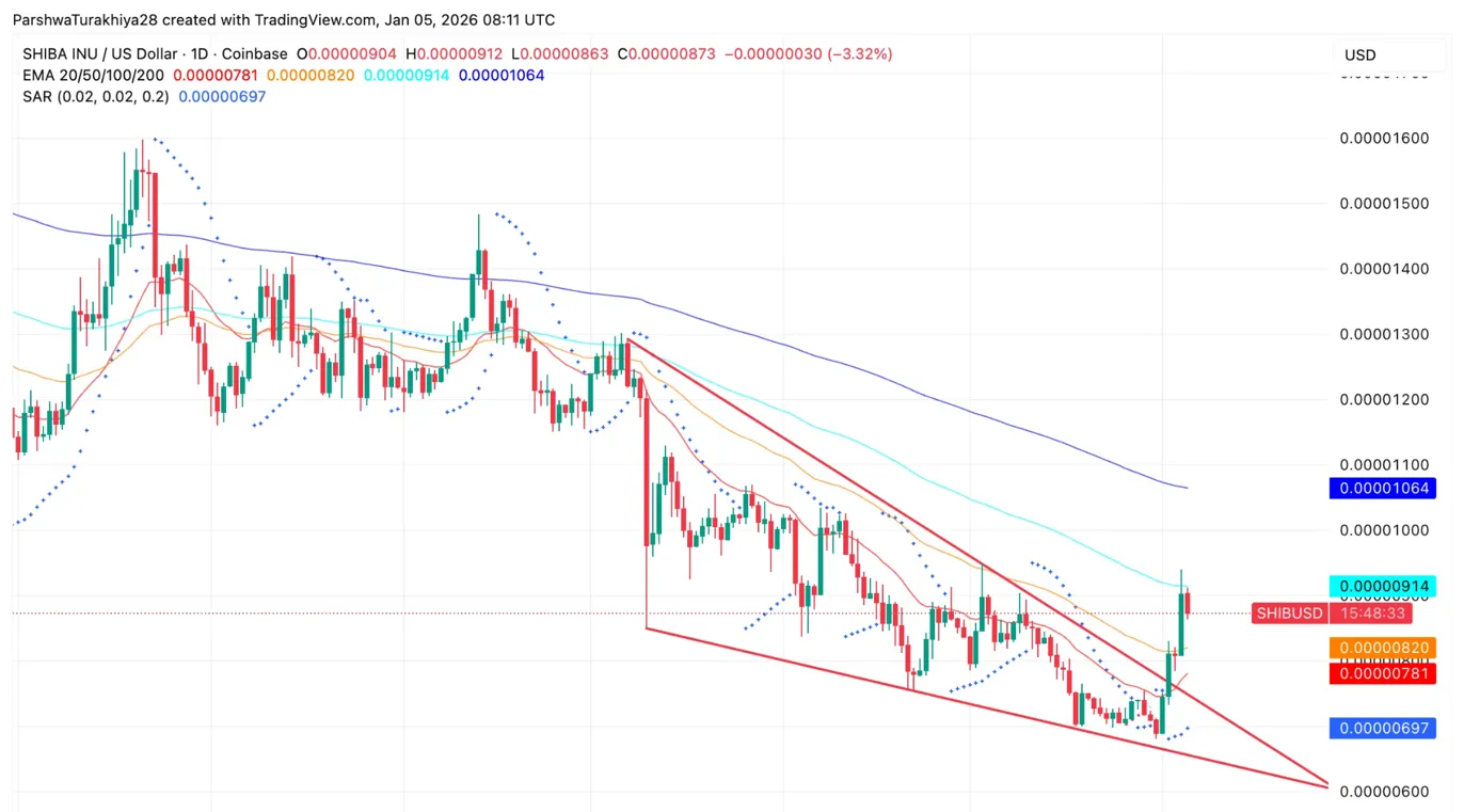 SHIBは$0.00000873で、8月の$0.00001650の高値から下降チャネルで取引されています。EMAは$0.00000781/$0.00000820/$0.00000914/$0.00001064で、混合シグナルを示しています。
