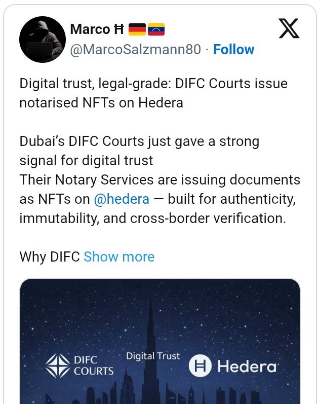 Source: CryptoNewsNet Original Title: Hedera Enters Judicial Infrastructure as DIFC Courts Issue Blockchain-Backed Documents Original Link: ドバイ国際金融センター((DIFC))裁判所は、デジタル信頼イニシアチブを承認し、ノータリーサービスにおいてHedera上で非代替性トークン((NFT))として文書を発行しています。このパートナーシップにより、機関や個人は重要な文書やデジタル資産を法的認証、透明性、安全性を持ってシームレスに保護できるようになります。
