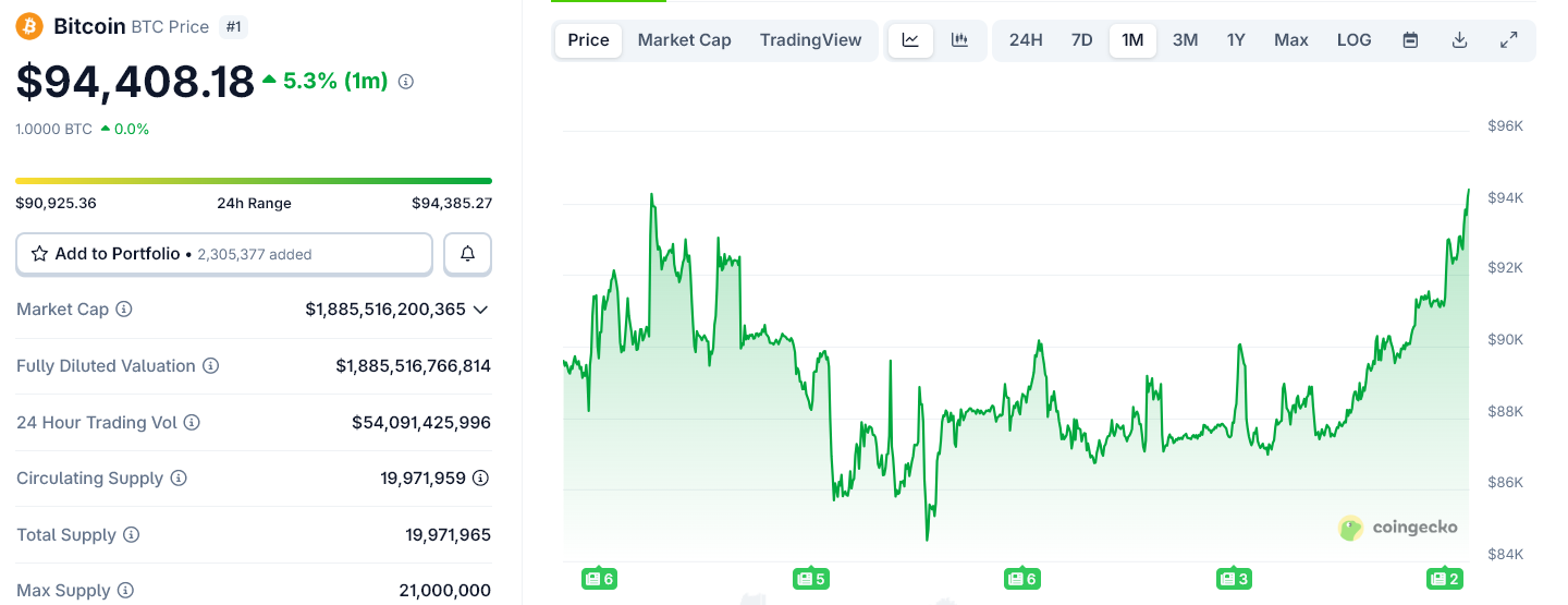 ビットコイン、ベネズエラの衝撃後にウォール街が高く始まり、94,000ドルを再び獲得