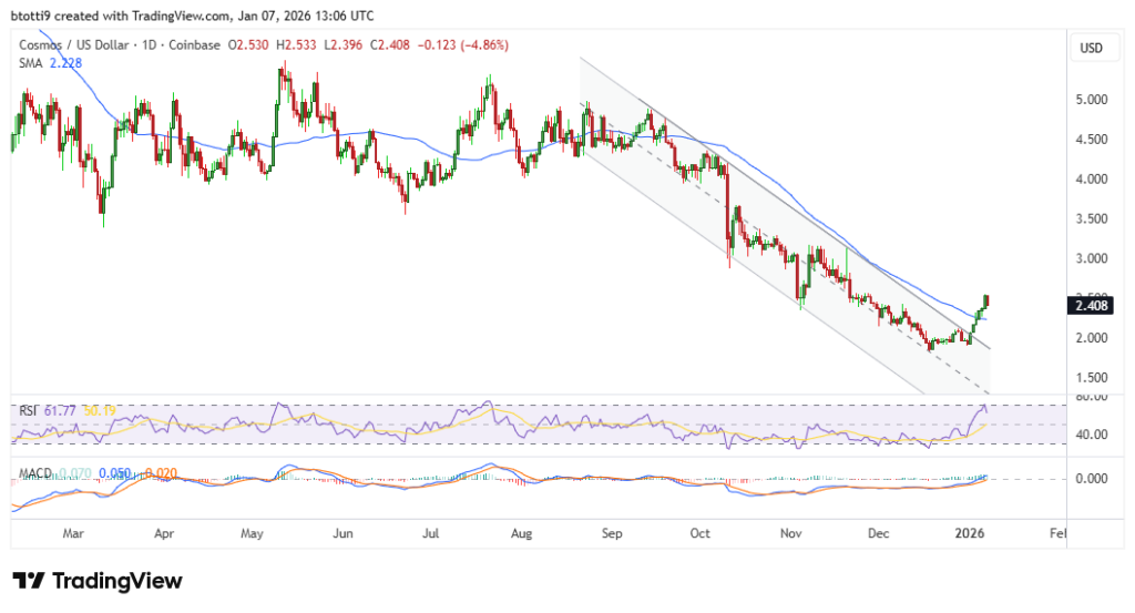 Cosmos HubCosmos (ATOM)価格は約2.41ドルで推移しており、水曜日に達した2.50ドルの高値からやや下回っています。