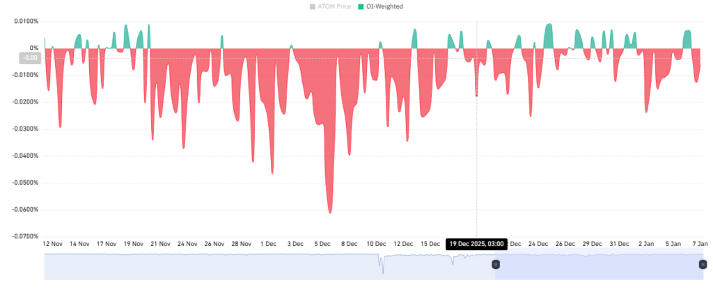 ATOMのオンチェーン指標は、わずかな売り圧力の蓄積を示しています。先物市場も信頼感の低下を示唆しています。