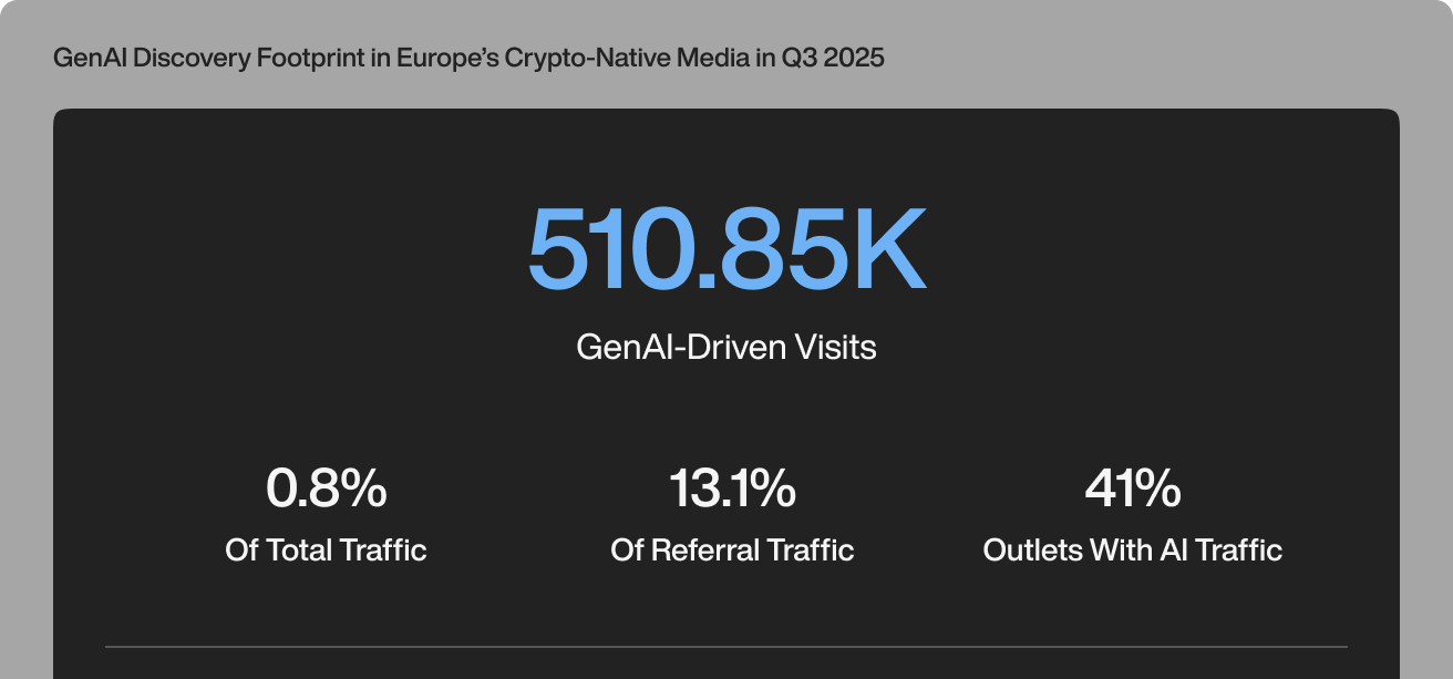 GenAIを活用した発見は、ヨーロッパの暗号メディアにとって二次的なトラフィック源であり続けていますが、その影響はもはや無視できません。