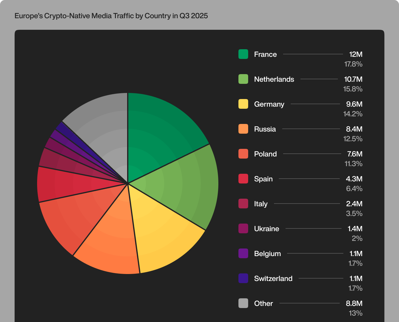 トラフィックの動態に関する大まかな数字を超えて、レポートは2025年第3四半期にヨーロッパの暗号メディアトラフィックをリードした5か国を示しています。これらは: