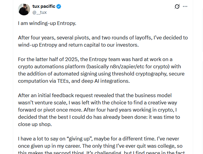 Entropyの創設者兼CEOのTux Pacificは、土曜日にXに投稿し、暗号自動化プラットフォームは運営数年後に前進の道筋が見えなくなったと述べました。