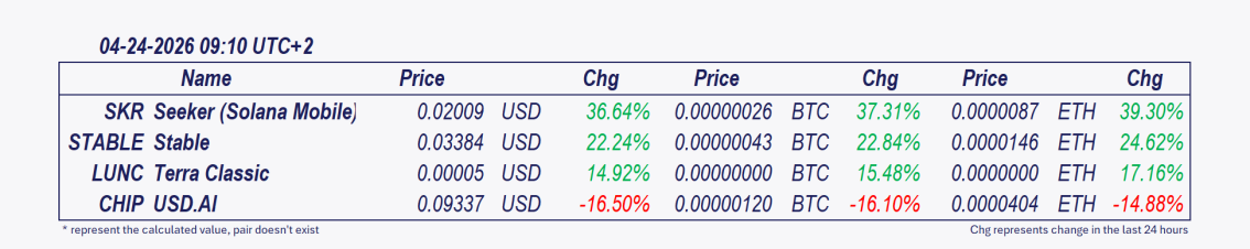 #### 直近24時間で最も動いたトークンとコイン:☀️ **9:00 – 朝の動向:選択的ローテーションが浮上、しかし市場全体は抵抗線以下に留まる –** **本日のトップ・ムーバー** * **Seeker (Solana Mobile) とステーブルコイン**は過去24時間で最も好調で、**Seeker (Solana Mobile)**は深夜以来の暗号市場最大のインラウンド上昇を記録し、33.61%急騰。💡*強気の勢い (条件付き) Seekerの価格は高い取引量の急増に支えられているが、明確なファンダメンタルのきっかけは見られない。この動きの持続性は、$0.020以上の価格維持と取引関心の強さにかかっている。注目ポイント:SKRは$0.020を上回って安定できるか、それとも巨大な取引量のスパイクによる利益確定が素早い反転を引き起こすか?***概要:** 過去24時間、暗号通貨市場は重要な抵抗線以下で振幅を繰り返す。 🔍 **市場インサイト:** NWST1100とブルーチップが構造的抵抗線以下に留まる場合、市場は通常内部でのローテーションを行っており、広範な回復局面には入っていない。 🧭 **戦略的見解:** 現在の局面は、修正的な調整と選択的ローテーション。最も可能性の高いシナリオ:市場は7.12〜7.27の範囲内で取引を続け、上昇の兆しはあるものの、ブルーチップが抵抗線を取り戻し、NWST1100が5,155.50付近に戻るまでは広範な確証は得られない。 1. **NWST1100 – 総合市場指数**:暗号市場のベンチマークであり、デジタル資産経済全体の決定的な指標。時価総額、流動性、DAOQEの質を合算した上位1,100資産を追跡。過去24時間で0.47%の調整を示した。2. **NWSBCT指数(ブルーチップ)**:リアルタイム取引可能なベンチマークNWSBCT (ブルーチップの一部を用いた投資可能な模倣指数)、通称「ブルーチップ」。日足チャートでは、NWSBCTは比較的狭いレンジで取引され、7.12付近に下落した後、7.18〜7.19付近まで回復している。📍 CET9時現在、約7.18で取引中。3. **2100NEWSインデックス**:さまざまなトークン・コイングループのパフォーマンスを追跡し、深夜からの変動は-0.29% (NWS30)から1.27% (NWSOT50)まで報告されている。4. **ビットコインとイーサリアム:** 過去24時間でビットコインは0.49%下落し、イーサリアムはビットコインを大きく下回り、1.91%の下落を記録。このレポートは、CET9時に終了した過去24時間の市場動向をカバー。トップ・ムーバーは24時間のパフォーマンスを示すが、最も注目すべきは深夜以降の最も大きな変動を示した資産。**2100NEWSインデックス**は00:00から9:00までの変動を示す。**2100NEWS総合指数 (NWST1100)**とビットコイン&イーサリアムのセクションは、報告時間に関係なく常に完全な24時間の変動を反映。公開以降に状況が変わっている可能性もある。ビットコインとイーサリアムのパフォーマンス分類((重要、やや重要、類似))は、過去のボラティリティの統計分析に基づく。***補足ノートでは、これら特定の暗号資産と指数をハイライトする基準について詳述—次回更新は14:00 CET。*** **Seeker (SKR)**| || --- || *2100NEWSランキング:269、ミッドキャップ非イーサリアムトークン、指数メンバー:NWST1100、NWSM200* || ***2100NEWS DA Orderbook Quality Evaluation Score:** 不良、スコア:7.1、(ミッドキャップ平均:12.1)* |Seekerは、TEEPinネットワークアーキテクチャとコミュニティガバナンスを通じて、既存のモバイル大手に挑戦する分散型モバイルエコシステムを構築している。中央集権的なアプリストアのゲートキーピング、開発者の自由制限、ユーザーの暗号アプリアクセスの制限といった課題に対処することを目指す。ビジョンは、分散型ガバナンスを持つコミュニティ所有のプラットフォームを作り、ゲートキーパーなし、直接開発者とユーザーがアクセスできる、TEEPinセキュリティアーキテクチャを備えたものだ。