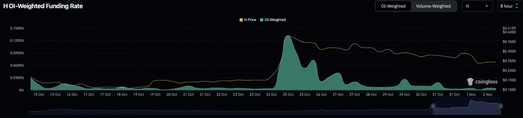 出典: CoinGlassHはチャート上で下落しているが、デリバティブ市場のファンディングレートの軌道は依然としてブル派に傾いている。このことは、ファンディングレートの指標が0.0067%という値を示しており、デリバティブからの流動性が依然として市場の上昇に賭けて強いことを確認している。