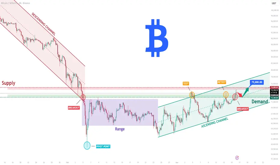 BTCUSDT Long: Retests 72,300 Demand - Bulls Aim for 75K