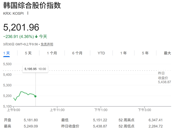 Korea’s KOSPI index opened down 4.93%, with the drop briefly widening to more than 5%. As of the time of publication, it was down 4.36%, at 5201.96 points. The Korea Kosdaq index fell by nearly 4%.