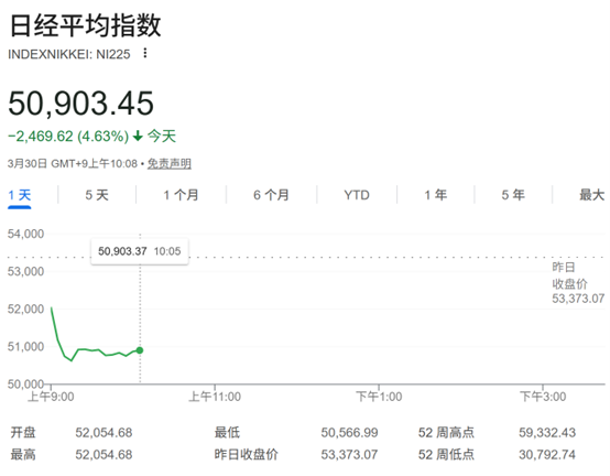 Japan’s Nikkei 225 index opened down 2.49%, and at one point during the session it plunged by more than 5%. As of the time of publication, the decline was 4.63%, to 50903.45 points. The TOPIX index fell 4.1%.
